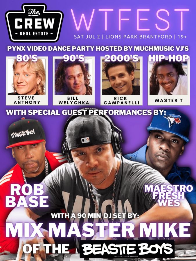 Time to Throw it Back! WTFEST Music Festival features live music from Maestro Fresh Wes, Rob Base, Mix Master Mike from the Beastie Boys! Also featuring PYNX Music Video parties hosted by classic Much VJs Steve Anthony. Bill Welychka, Rick Capanelli, and Master T! They’ll be personally curating playlists for a fun dance party!